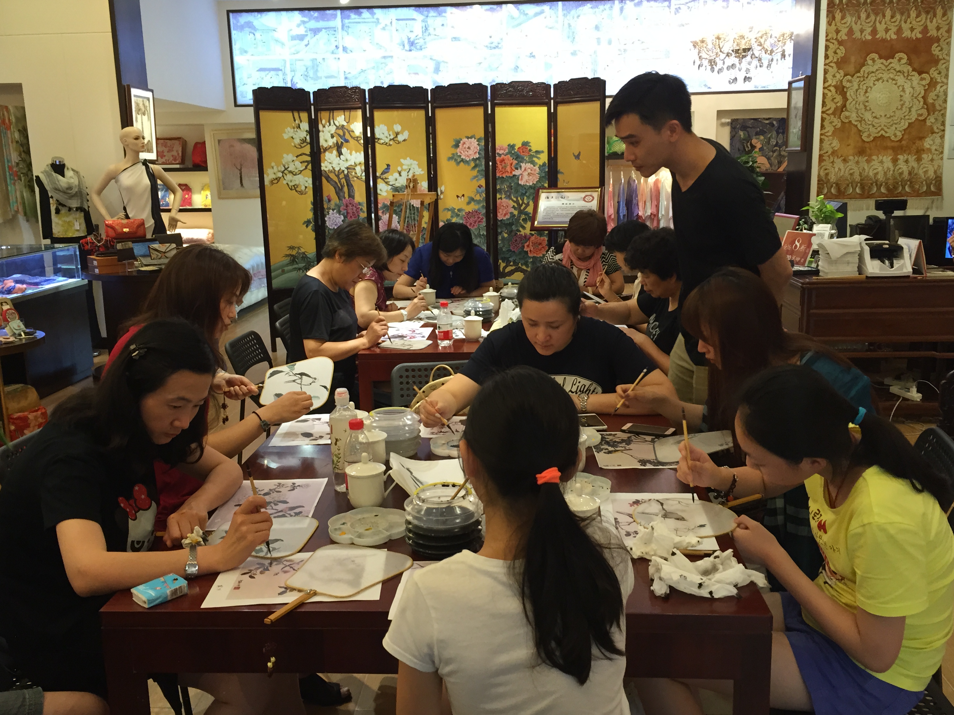 不像传统的作画需精修细作,团扇的扇面不拘泥于某种形式,即便是“失误”亦能顺势而作,与整体融合增添亮点,这也是珍贵之处。更别说有海上丝韵专业画师为您讲解,帮您提点,即使没有任何绘画功底,作品也必定要让您刮目相看。