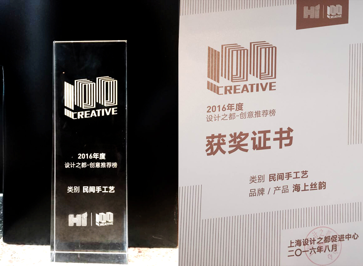 在2016上海设计之都活动周开幕之际,经过大众投票及国际专家评审团评审,“海上丝韵”入选2016设计之都创意推荐榜民间手工艺榜前10强。全市其他9个入选品牌分别是张铁军珠宝,李黎明,忠荣玉典,梵诚漆器,守白艺术,艺尊轩,汉光瓷,亚振家具,De Color等。“海上丝韵”同时作为优秀时尚生活精品参加上海设计之都活动周展览。