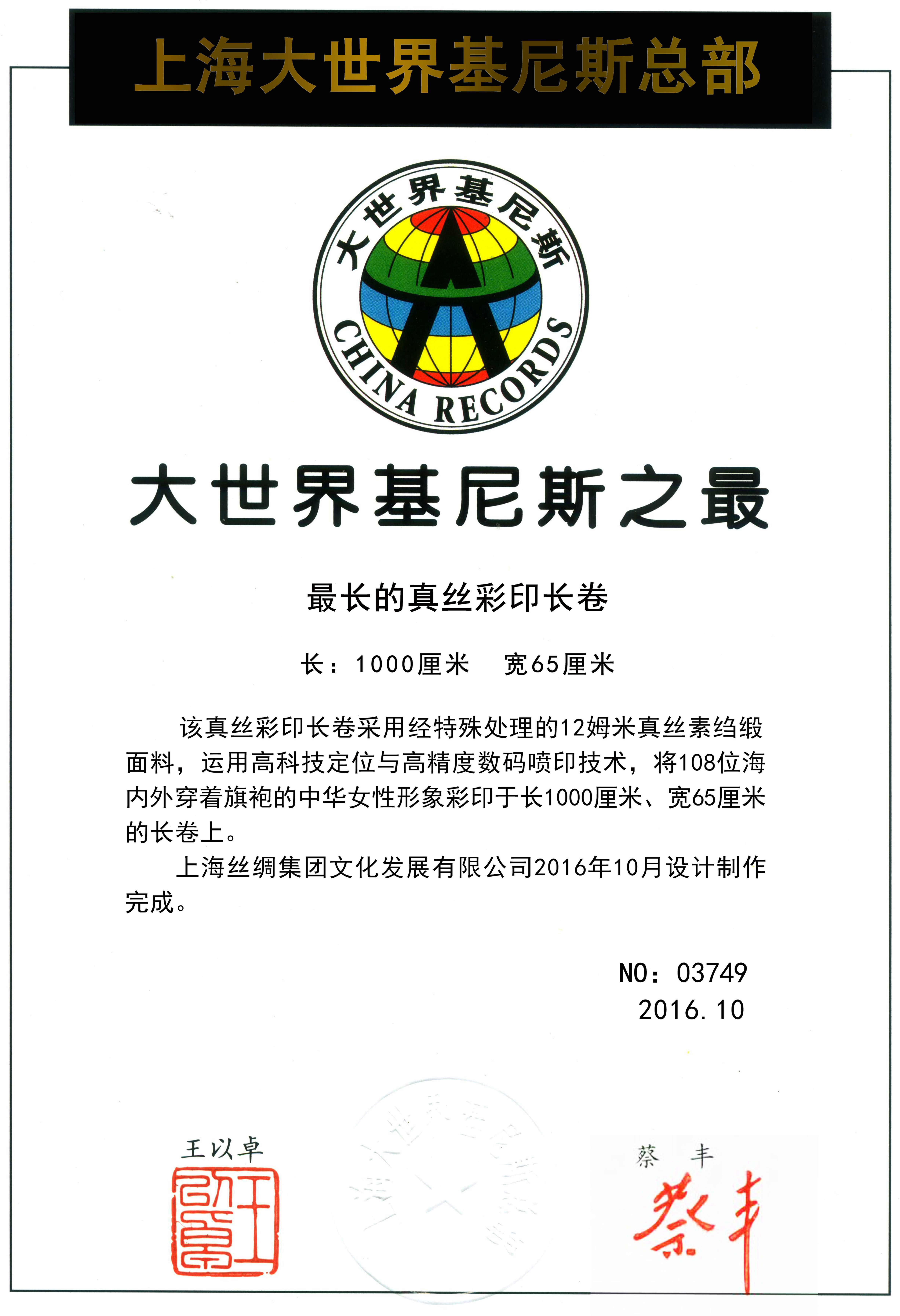 风和日丽,金风送喜。上海丝绸集团文化发展有限公司精心创作的海上丝韵“中华情”真丝长卷首创“大世界吉尼斯之最”纪录,该项纪录近日已获得大世界吉尼斯总部官方确认,并将于2016年11月在澳大利亚悉尼歌剧院举行“2016大世界基尼斯之最”授牌仪式。