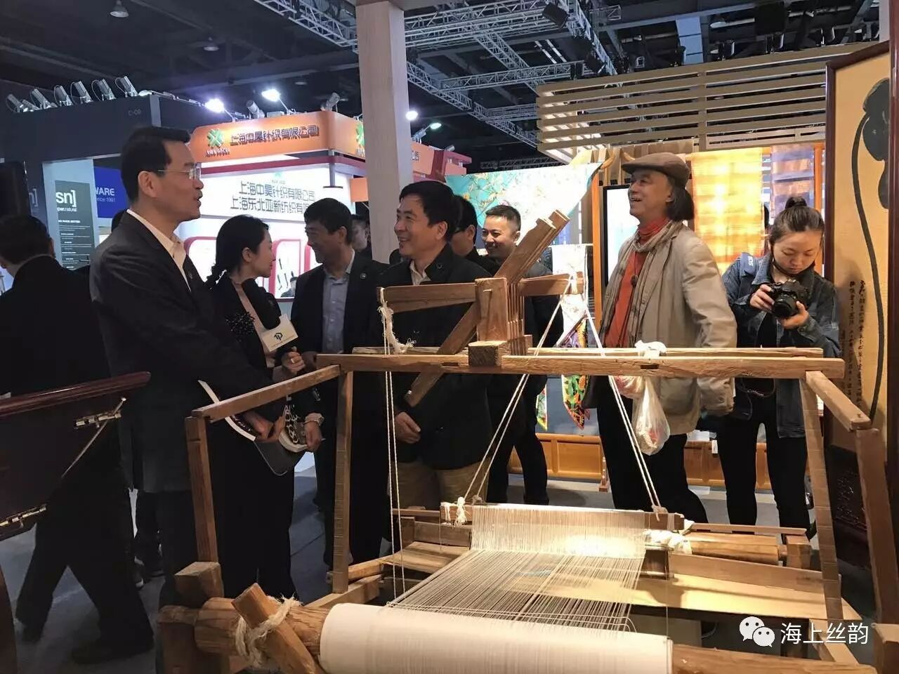 开展当日,国家工信部科技司副司长沙南生、上海市经信委副主任、上海市文创办常务副主任陈跃华等领导参观了海上丝韵展厅,仔细了解海上丝韵品牌的展示亮点、缂丝制作工艺,并就如何发扬丝绸文化等与上海丝绸集团文化发展有限公司董事长吕钢进行了交流和探讨,大家一致对海上丝韵在传承和创新丝绸文化方面做的努力表示赞赏。